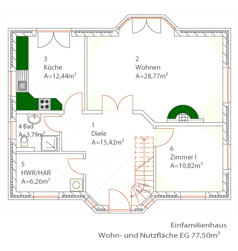 | Wohnbereich | 28,77 m² | Zimmer 3 | 13,88 m² |