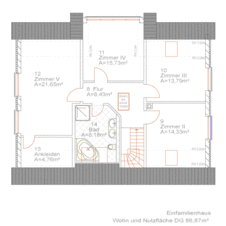 | Wohnbereich | 42,47 m² | Zimmer 3 | 13,79 m² |